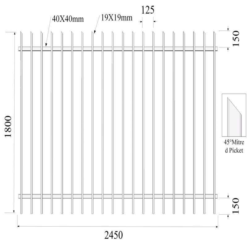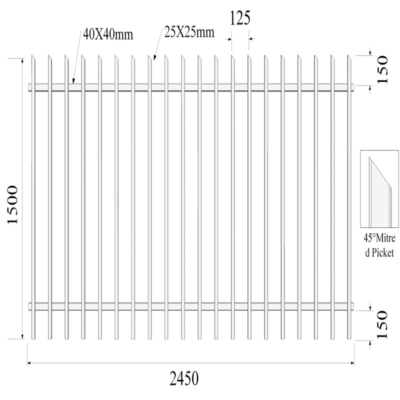| Fence Height (mm) | Fence Width (mm) | Rail Frame (mm) | Rail Thickness (mm) | Upright (mm) | Upright Thickness (mm) | Upright Spacing (mm) | Upright Qty (pcs) | Fence Post Option (mm) | Post Wall Thickness (mm) | Fence Post Height (mm) | Finish |