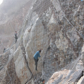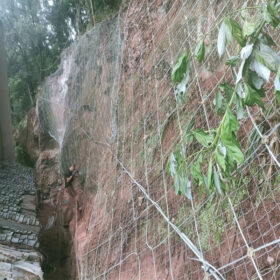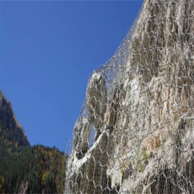 These two layers are fixed to the rock slope with wire rope anchors (Ø16 mm, 2–3 m long) and support ropes (typically 16 mm horizontal, 12–16 mm vertical) to form a continuous flexible shell over the slope.