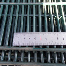 | Green powder coating 2D security fencing with 6mm vertical wire and 4mm double horizontal wire | 2D security fencing panel detail installed on a post |