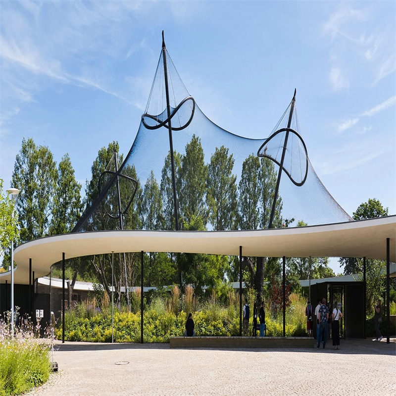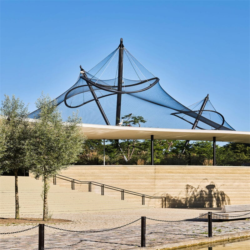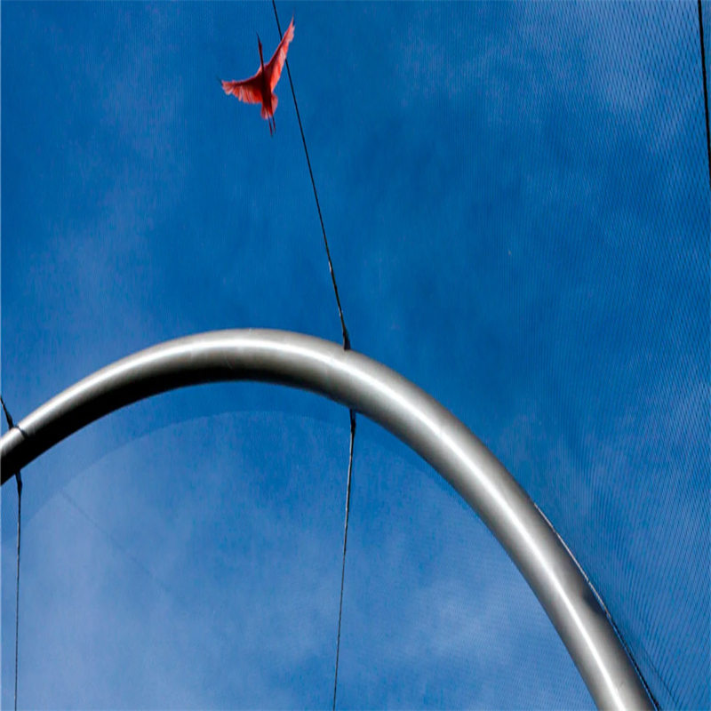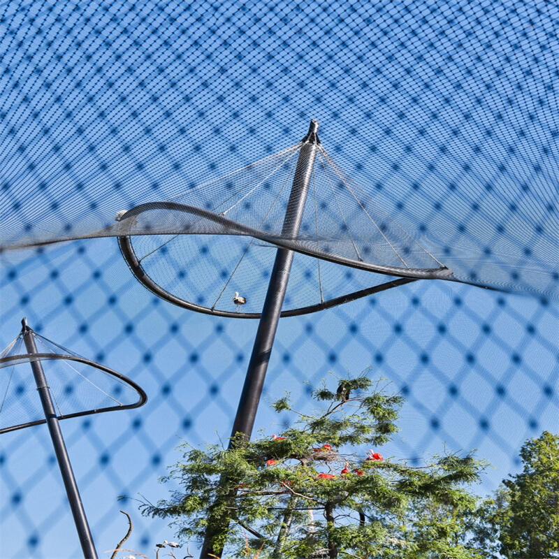 Because the mesh is flexible, one continuous sheet can wrap over curved roofs, follow organic shapes and cover large spans with minimal structural steel. From inside the enclosure, birds see mostly sky and trees instead of feeling “caged”.