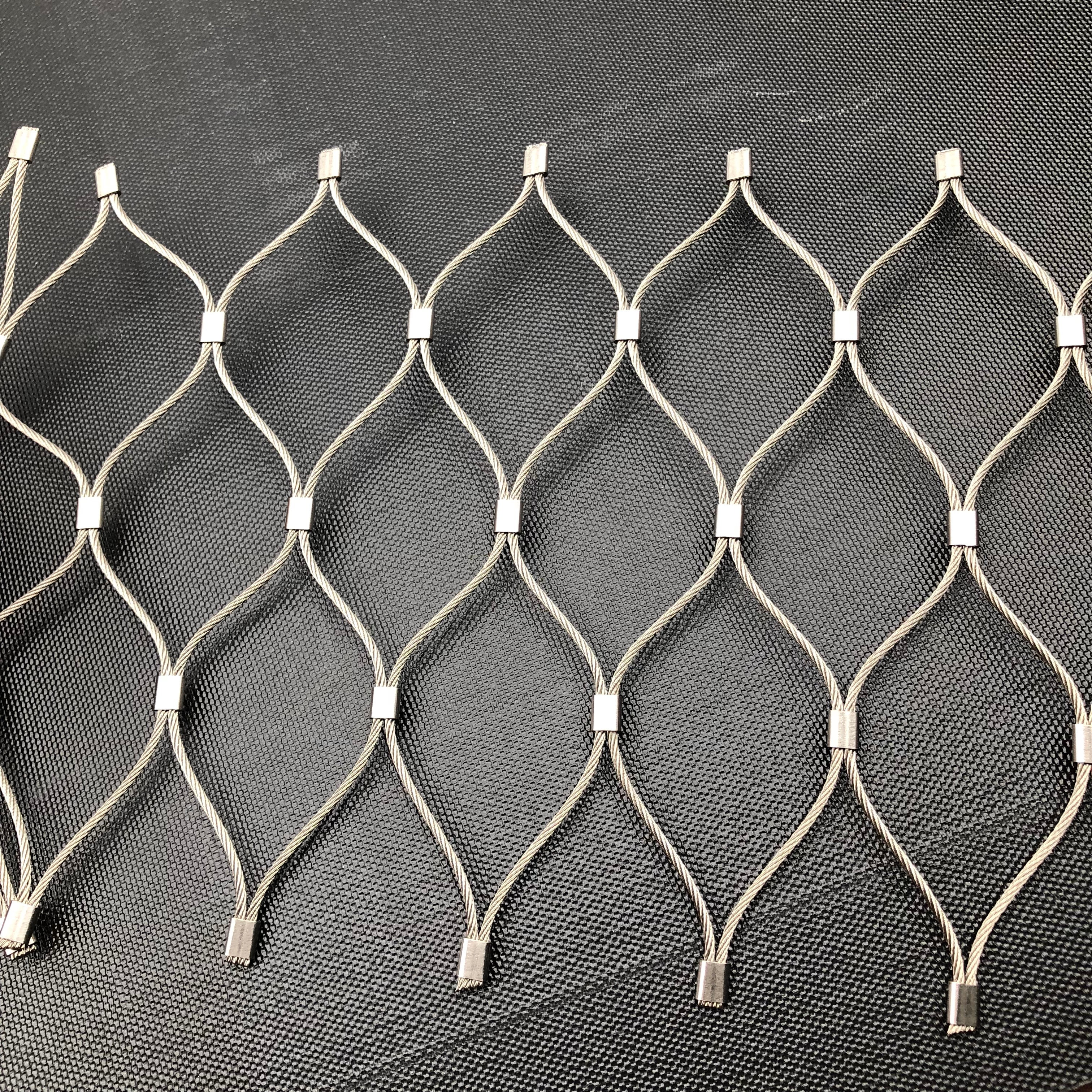 Stainless Steel Wire Rope ferrule mesh is a rhombus mesh with excellent flexible performance, virtually indestructible, high impact resistance and strong breaking strength, and it effectively resists rain, snow and hurricane. Because the material is high grade stainless steel, stainless steel cable mesh can safely contain any species on land or in the air, indoors or outdoors. The weave opening of stainless steel cable mesh can be infinitely customized to match your exact exhibit or project specifications and ensure complete security.