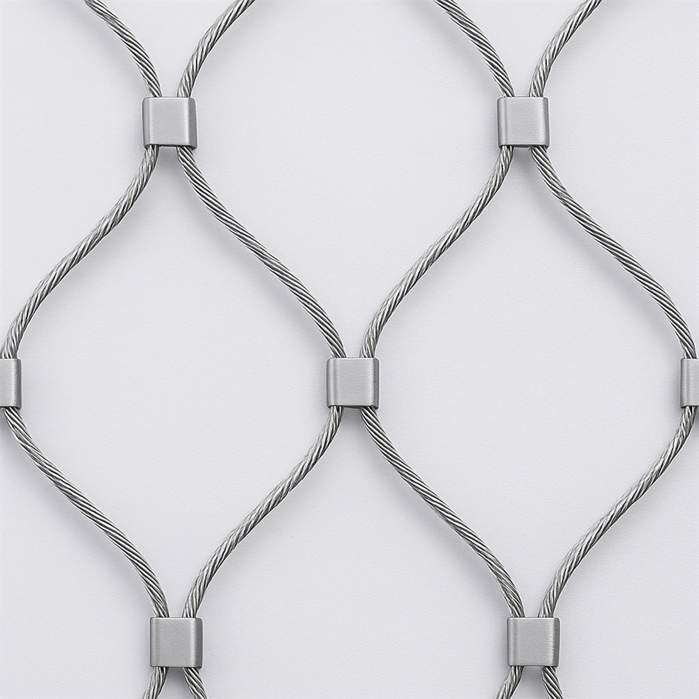 Stainless steel rope mesh with ferrules is woven from 7×7 or 7×19 stainless steel wire ropes and then crimped with high-precision ferrules made from the same stainless steel grade, with each ferrule firmly joining two neighboring cables so that the whole mesh forms continuous diamond-shaped openings and works as one strong and flexible net.